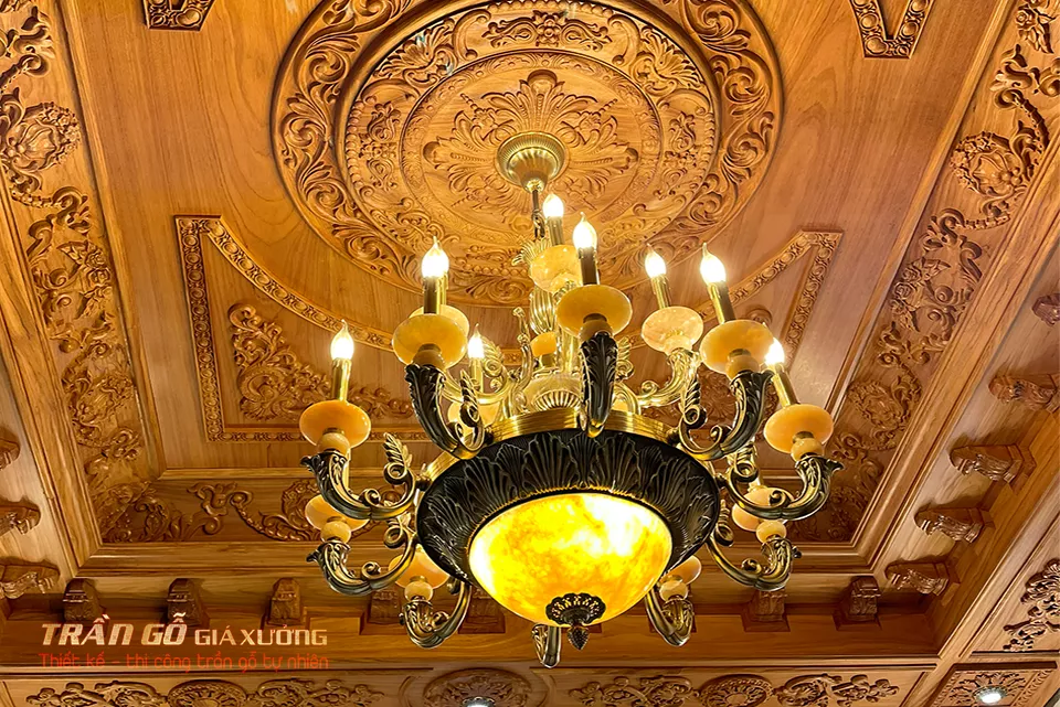 Trần gỗ kiểu cổ điển gỗ kết hợp đèn chùm đèn led đẹp